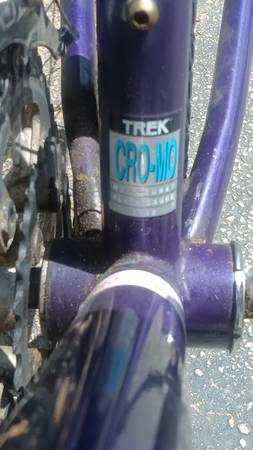1991 Trek Model 720 Multitrack. 17" frame (17.75" from center of crank to top of seat tube). Chro-moly main tubes and fork. Probably best fits a rider between 5'4" and 5'8". Purple with white on silver and conch decals. Good paint with a few paint chips on top tube. 21 speed drivetrain (3×7). Schwalbe Marathon Mondial 700 x 35c touring tires with over 50% tread remaining. New Shimano Revo-shift grip shifters and shift cables. Tuned up and ready to ride. Reply via craigslist email or text.