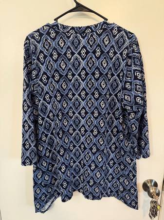 Blue and white geometric patterned tunic top. Pickup is in West Midtown on Northside Drive