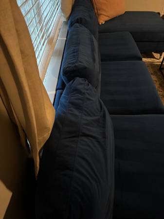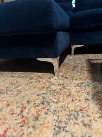 Marshburn Velvet 130.5" Symmetrical Navy Blue Couch - 2 Chaise Lounge Seats. Purchased from Wayfair. With its clean lines, low profile, and velvet upholstery, this solid-hued sectional is brimming with modern appeal. Founded atop metal bracket feet in a sleek chrome finish, this U-shaped piece is crafted with a solid wood frame, foam fill, and sinuous spring supports for an approachable look. Pillowtop arms make this streamlined sectional even more inviting. Spanning 130.5" wide, this generously sized design can seat six comfortably. No tears. No smoking. No pets. Excellent condition. No scams please. Serious buyers only. Zelle or Apple payment only. No cash! Sectional. Double chaise. Velvet. Navy-blue.