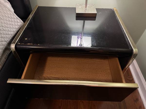 Two drawer block with gold accent nightstand. OK in a picture you can see it’s not new it’s used. The price is negotiable, but we will only reply to reasonable counter offers.