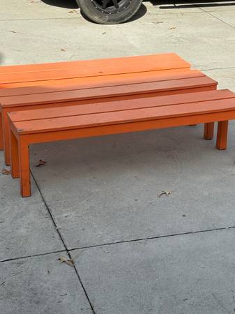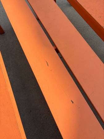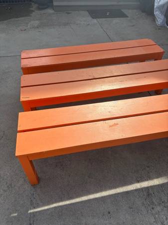 Trio of awesome heavy long (FIVE feet plus) solid wood orange benches. So cool and a million uses! Each $50 or $145 for all 3. Very nicely made custom and built to last and hold good weight. Good condition but just need paint freshen up or repainting.