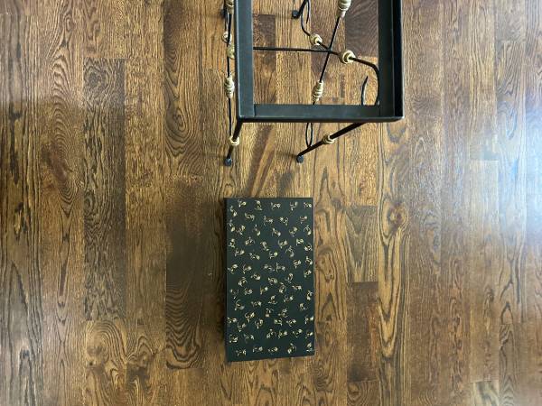 This is a beautiful Sarreid Ltd. black box stand. The stand is made of metal painted in black with gold accents. The box is made of wood, painted in black with gold accents. The box is in the shape of three books and opens up to a hidden compartment. Neat little piece. It can be used as an accent piece in a corner as shown (lamp and brass box not included) or as a small side table or just use the books with the hidden compartment anywhere. The dimensions are 17”x9”x27.25”. It is in great shape. Asking $215.