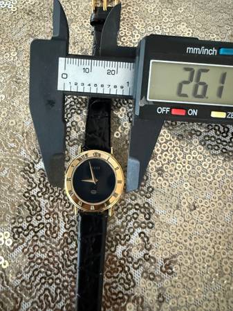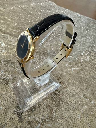 The Gucci 3000L is a vintage women’s wristwatch featuring a compact 26mm gold-plated round case, a sleek black dial with Roman numerals, and a Swiss ETA quartz movement for accurate timekeeping. Produced in the early 1990s, it reflects Gucci’s classic minimalist style, combining fashion and function. The watch comes with a black leather strap and is considered a stylish accessory rather than a high-end horological piece. The watch remains a timeless, elegant choice for everyday wear. Fresh battery.