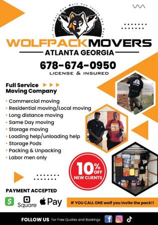 We specialize in local household moving, commercial and office moves, packing, load or unload only assistance, in-house moves, storage, pods,unpacking, and Junk Removal service.We primarily operate in the greater Atlanta area. If you call one wolf ๐บ you invite the pack ๐บ๐บ๐บ!! CALL ๐ฑ NOW 678-674-0950 Mr.Johnson