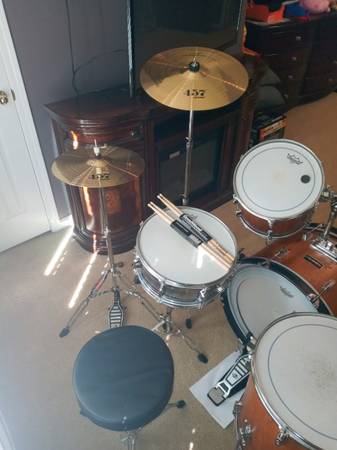Peavey International series 3 pc (22" bass, 12" & 16" toms) with Percussion Pluss snare (14x5). There is $750 of new parts on this set and I am selling them for $750, so the drums are basically free. These sound great for inexpensive drums. Perfect for beginner or even for intermediate or pro drummer that wants a practice set or a set to leave at a practice location. There is no rust and these have never been kept in a garage or outbuilding. Previous owner removed wrap and stained the shells. He did a decent job. There are some minor scrapes but are very hard to see because the wood is not real smooth anyway. He even re-installed the badges and added the new heads and bass drum spurs. The bass drum spurs did not match the existing holes and he could have done a better job with this, but it never bothered me enough to change it. I added the snare (excellent condition), cymbal pack and hdwe pack to make it easier to sell. All the following parts are new. Gibraltar Pro bass drum spurs $64.99 - DW 2 pc bass drum muffling pillow $49.99 - Remo Pinstripe coated batter 12" $19.99 & 16" $24.95 - Remo Ambassador clear resonant 12" $19.99 & 16" $25.95 - Remo Diplomat Classic Fiberskyn 22" resonant $58.99 - Remo Powerstroke Pro coated batter 22" $59.99 - Wuhan 457 Cymbal Pack new in box (taken out for photos) 20" ride 16" crash 14" hi hats $176.57 - Griffin 6 pc hdwe pack new in boxes (taken out for photos) $165.00 - Remo Ambassador 14" coated batter on snare $23.95 = $690.36 plus $55.23 tax = $745.59 plus misc (sticks) $4.41 = $750. Most of these prices are from Sweetwater. The condition is better than good but not excellent, so I'll call them very good. If you have your own cymbals and hdwe, I will sell the drums seperately with or without the snare. Please, no phone calls before 10am or after 9pm.