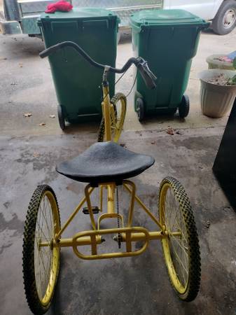 Yellow and black old school tricycle. Need some work however a good bike for exercising or just using it for delivering around the city call