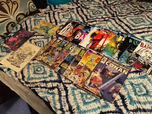I have 9 Conan the Barbarian eight of them are complete three of them have the front back missing but they're still there they're just not attached. There is one new in the plastic powered the duck, and then there are several brand new in the plastic Batman there is one book little engine that could pop up and one signed comic alone by itself here is the complete list as much as possible I do not know much about these so I'm doing the best I can:
