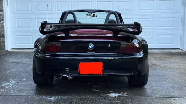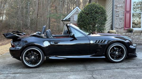 This 1997 BMW Z3 2.8 Liter 5 speed manual has only 22.8k miles with title in hand. The car was refinished in black with custom woodgrain-style accents under previous ownership, and additional modifications include a vented hood, a revised body kit, an aftermarket rear wing, staggered-diameter wheels, retrofitted red and black leather upholstery, sport exhaust (not loud but nice sound) and aftermarket audio components. Black convertible soft top is in excellent condition, cruise control, woodgrain interior trim, heat works and AC is cold.