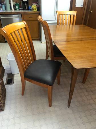 Table and five chairs that match each other and one chair that is added to complete the set. We have more chairs if you are interested. The table is solid wood (MCM) the chairs are later and cushioned (5 of them). The table has a removable center leaf.