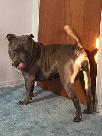 5 year old blue bully. She is the sweetest and most loving dog I have ever owned. Unfortunately I have to relocate and will not be able to keep her. She prefers a back yard over inside.