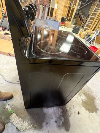 General Electric (GE) black electric smooth-top range / flat-top stove in excellent condition. We bought it brand new and it was used for about 1 year in a clean home. Everything works properly — burners heat evenly, controls function as they should, and it’s been wiped down and cleaned (just a little normal cosmetic dust/smudges from being stored).