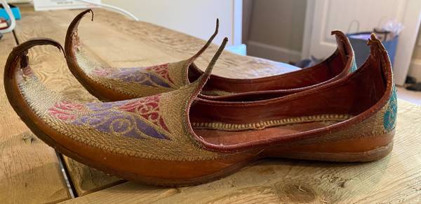 Antique Turkish leather Moorish Mughal embroidered shoes 12” long