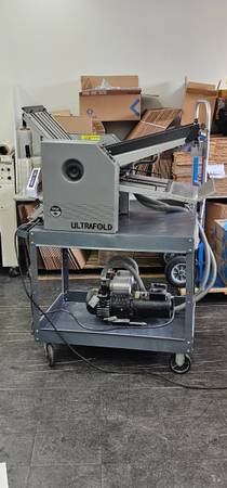 The Baumfolder Ultrafold 714 Air Feed is a versatile and unique machine, capable of folding paper measuring between 3″ x 5″ and 14″ by 20″ , at speeds of up to 35,000 sheets per hour of 8 1/2″ x 11″ and up to 65,000 sheets per hour of 3″ x 5″. The Baumfolder Ultrafold 714 is capable of making up to six types of folds: Letter Fold, Fan Fold, Double Parallel Fold, Single Fold, French Fold, Double Letter Fold, and Engineering Fold.