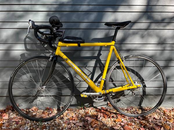 Up for sale is this vintage Cannondale 2.8 aluminum triathlon racing bike. I believe this is a 1996 R700, the first year for a carbon fiber front fork. These frames were made from 1992-1996. Condition is good with scuffs from use. There is one dent on the top tube that you can see below the top tube bag.