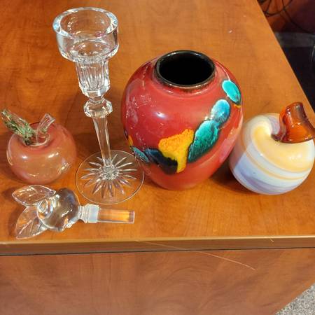 Russian art-glass apple $10, crystal candle holder $10, crystal apple from Poland $10, crystal peach bottle stopper $10 or All 4 for $30 (ceramic vase is no longer available)