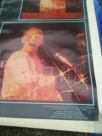 ☆ This is a Rare Elton John Superposter! 1974 Vintage ☆ Measures 42" wide X 58" length. Torn in half by a disgruntled record store owner back in the 1970's. Lovingly and painstakingly taped back together again. Good Condition overall. Scratches on top corner. Lower center left- black on poster coming off.