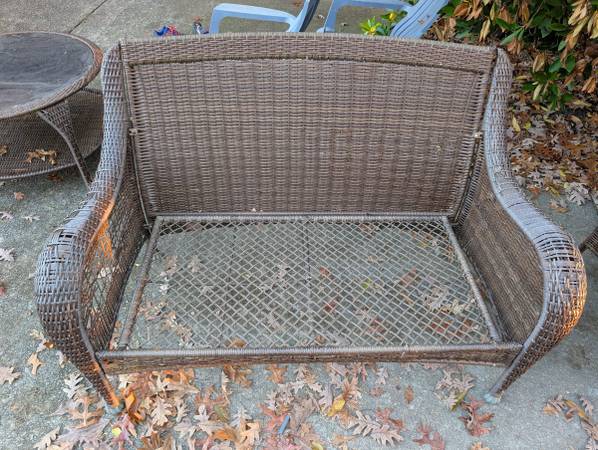 Better Homes patio set. Wicker style. Solid/stable. Some of the wicker shows where but overall the set is in good condition. We redid our deck and changed the layout so replaced furniture.
