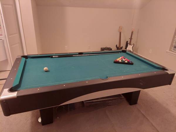 Good pool table no rips in fabric. The bottom part of the legs were taken off due to being short - see pictures. You can put them back on. Pool balls, pool sticks 2 wood - 1 aluminum and rack...