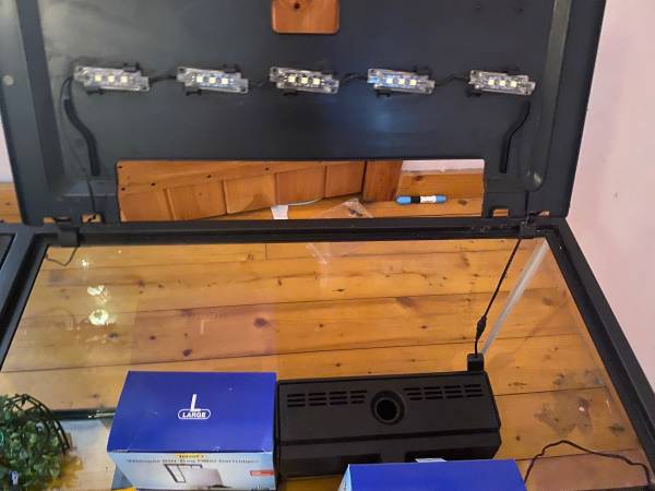 $150 OBO I am mostly just trying to get rid of this. Works well and holds water, comes with a working filter, hood lights, and some random decor. Must come pick it up. It is long and pretty heavy....