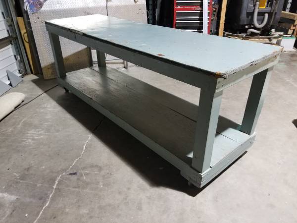 Sturdy table on wheels with bottom shelf perfect for work space in a shop or garage. Made of heavy wood. Only 1 left. 37" tall 8' long 30" wide $70 cash