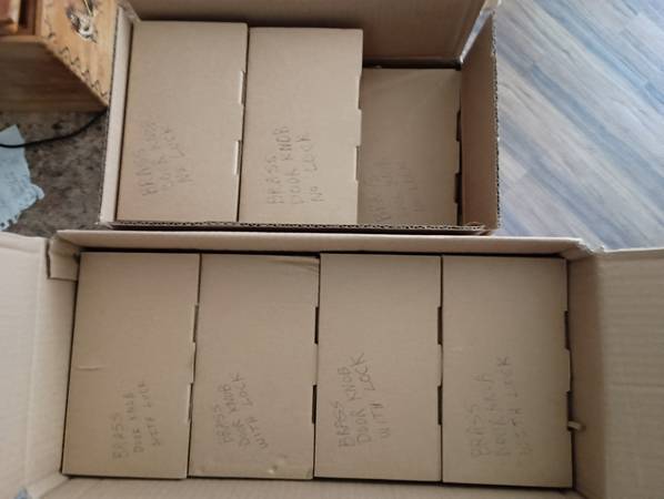 Used but in good shape. A couple have paint splatters that would have to be cleaned off. All hardware including screws and strike plates included. Each Door Knob set is packaged separately in boxes.