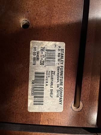 Stanley furniture solid real wood entertainment center. Can accommodate 65" TV. Has plenty of space, glass shelfs and lighting. Measurements width 84", height 83" and depth 18".