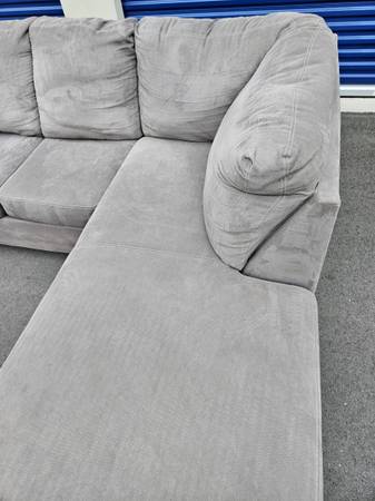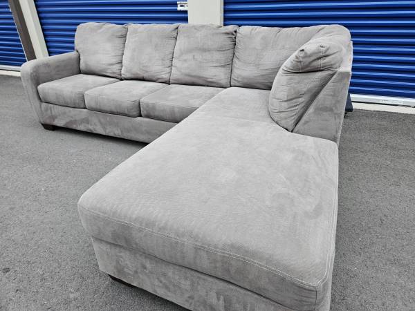 Pre-owned 2 piece sectional with right hand chaise. Grey fabric material. Recently cleaned and vacuumed. Frame/ springs are solid. Frame and springs are solid. Bottom cushions are detachable with zippers. Back cushions are not detachable.