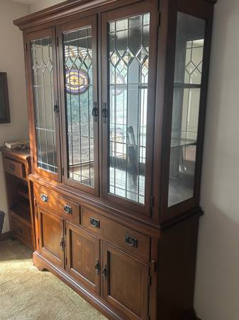 Beautiful dining table and 6 chairs with China hutch and side piece furniture. Comes with extra section for table extension and wine cabinet $1900 price reduced from $2500
