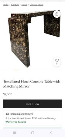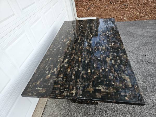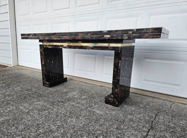 Vintage Jimeco LTDA Tessellated Horn Flip-Top console / dining table featuring geometric inlay of polished black and beige horn pieces arranged in a beautiful mosaic pattern.