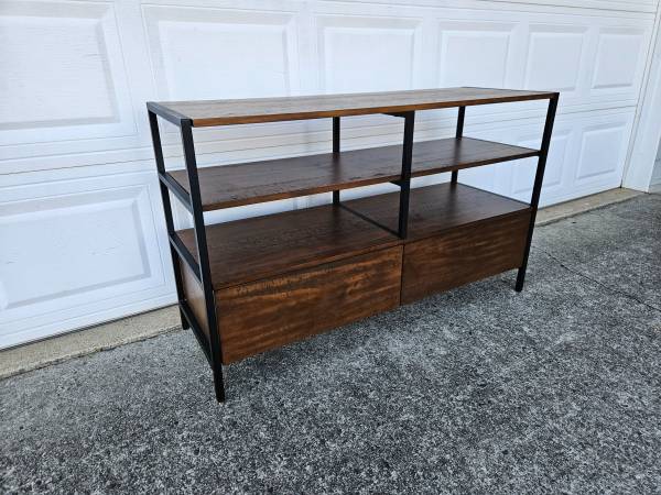 Add this to your modern, industrial, or rustic decor, for a unique statement piece. Featuring a rich brown textured wood grain finish framed by black powder coated metal. The metal framing adds stability, as well as contrast, to create an eye-catching design.