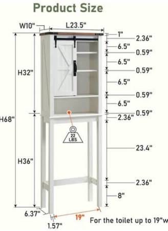 [BATHROOM ORGANIZER] 23.5" L × 10" W × 68" H, This cabinet occupies the often-unused space above your toilet, bringing even more storage options to your bathroom without taking up too much space. An open shelf and one cabinet with sliding barn door act as perches for toilet cleaners, washcloths or toilet rolls