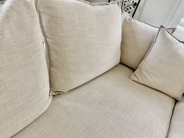 Downsizing Sale: Excellent, like new condition oyster/cream colored 2-piece modular sectional for sale this weekend. Each piece is identical: 77x41x25. When set up as a sectional, the arm faces to the left. Pillows are generously down filled and easily re-shapable. Clean and beautiful with no stains or spills. Feet are optional (included). Priced to sell much lower than retail. :) Cash and carry only. Buyer will need to come with their own man power and transportation. Please only text with serious inquiries and good intentions. Dee show contact info