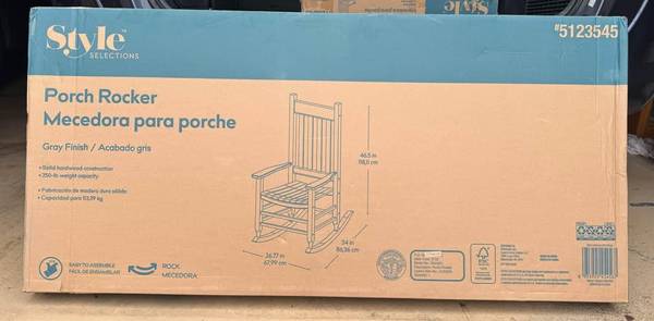 Brand new, unopened in the original box. Style Selections Grey Wood Frame Rocking Chair with Slat Seat