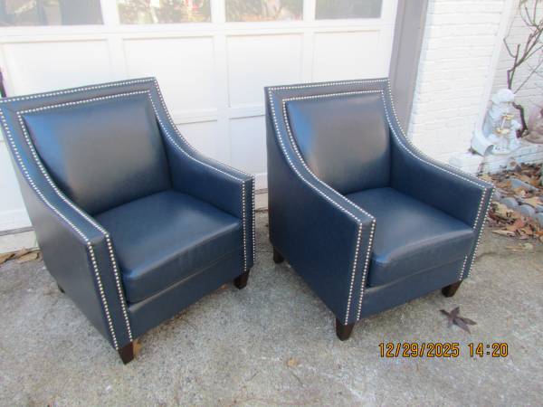 IN EXCELLENT CONDITION TWO ELEGANT LEATHER ABBYSON DARK BLUE CHAIRS $350.00 ORIGINAL PRICE $659.00 ea, IF INTERESTED PLEASE CONTACT HARRY AT