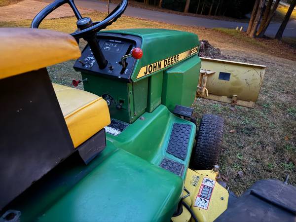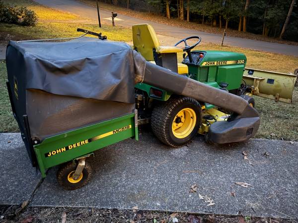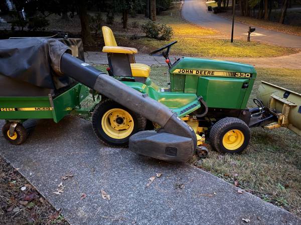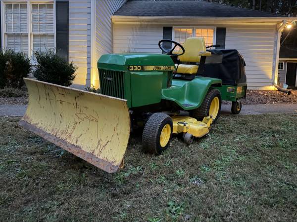 This is a 1986 John Deere 330 (single-year model) in great condition with the mid-mount mower deck, John Deere 3 point Hitch, hydraulic front blade, and the John Deere MC519 collection system. Starts easily, runs strong, and is ready for mowing, pushing, and collection. Well cared for, garage kept, and maintained—perfect for acreage, leaf clean-up, and snow/driveway work.