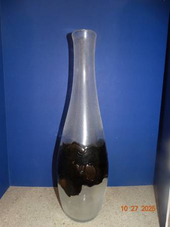 This vase is made of extremely thick glass and is very heavy. It is from Studio A Home Accents. The clear glass is very coarse and rough like sandpaper. First the clear vase was formed and before it was cooled, a molten topaz layer was wrapped around its center. The random nature of the molten glass application creates variation in each individual vase making them one of a kind. It is 22" high. This vase was selling on line for $80.