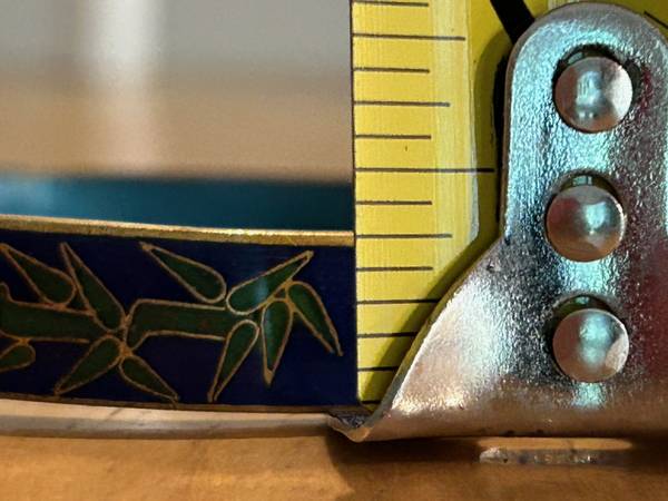 Cloisonné is an ancient decorative art technique that involves soldering or affixing thin metal wires onto a metal base to create cells or "cloisons," which are then filled with colored enamel and fired. The resulting effect is a vibrant, intricate design with raised metal outlines separating the colors.
