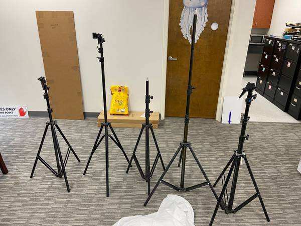 (5) Stands, (4) heads, (3) 1000w LED bulbs + incandescent , boom light, Soft box diffusers, backdrop stand with 6'x12' white fabric, (2) strobes with hot shoe connector, misc carry bags.
