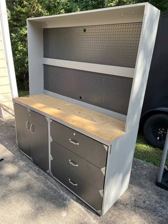 Garage free standing cabinets and workbench/hutch Lockable need some work on one cabinet door and hutch. $45 OBO cash only please. Text please