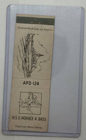 USS Horace A. Bass (APD-124) - APD Transport: Another excellent APD-class transport matchbook, this one showcasing a unique cartoon mascot. Highlights the personality of these smaller, combat-ready ships.
